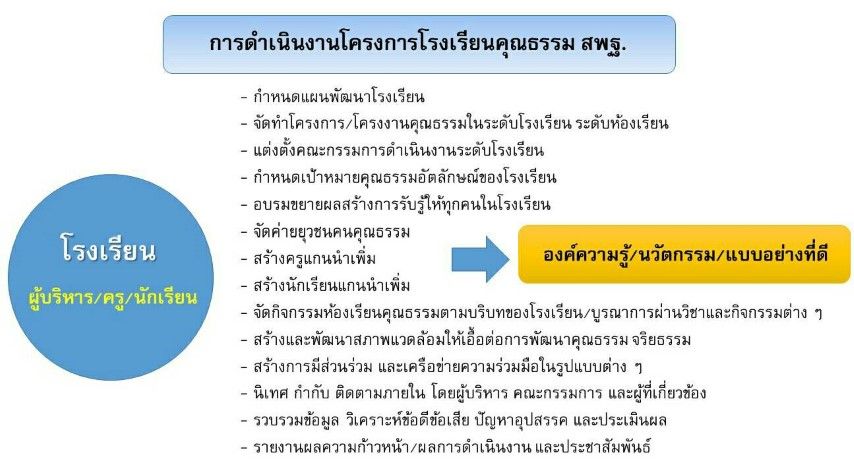 "โรงเรียนคุณธรรม" เป็นเรื่องที่ทั้งผู้บริหาร ครู นักเรียน และบุคลากรที่เกี่ยวข้องภายในโรงเรียนต้องร่วมกันวางแผนร่วมกันดำเนินงาน เปิดโอกาสให้ผู้ปกครองนักเรียน ชุมชน และผู้ที่มีส่วนเกี่ยวข้องจากทุกภาคส่วนทั้งภาครัฐและภาคเอกชน โดยสร้างการมีส่วนร่วม สร้างเครือข่ายในการขับเคลื่อนนโยบายสู่การปฏิบัติผ่านแผนงาน/โครงการ/โครงงาน/กิจกรรมรูปแบบต่าง ๆ ทั้งภายในและภายนอกสถานศึกษา เพื่อนำไปสู่การพัฒนาและปรับเปลี่ยนพฤติกรรมที่พึงประสงค์ให้เพิ่มขึ้น และปรับเปลี่ยนพฤติกรรมที่ไม่พึงประสงค์ให้ลดลง สร้างและพัฒนาให้มีองค์ความรู้/นวัตกรรมการสร้างเสริมคุณธรรม จริยธรรมอย่างต่อเนื่องและเป็นระบบ ร่วมกันตรวจสอบ นิเทศ ติดตาม จากทั้งภายในโดยผู้บริหาร ครู และผู้ที่เกี่ยวข้อง และภายนอก โดยศึกษานิเทศก์ สำนักงานเขตพื้นที่การศึกษา และหน่วยงานอื่นที่เกี่ยวข้อง
